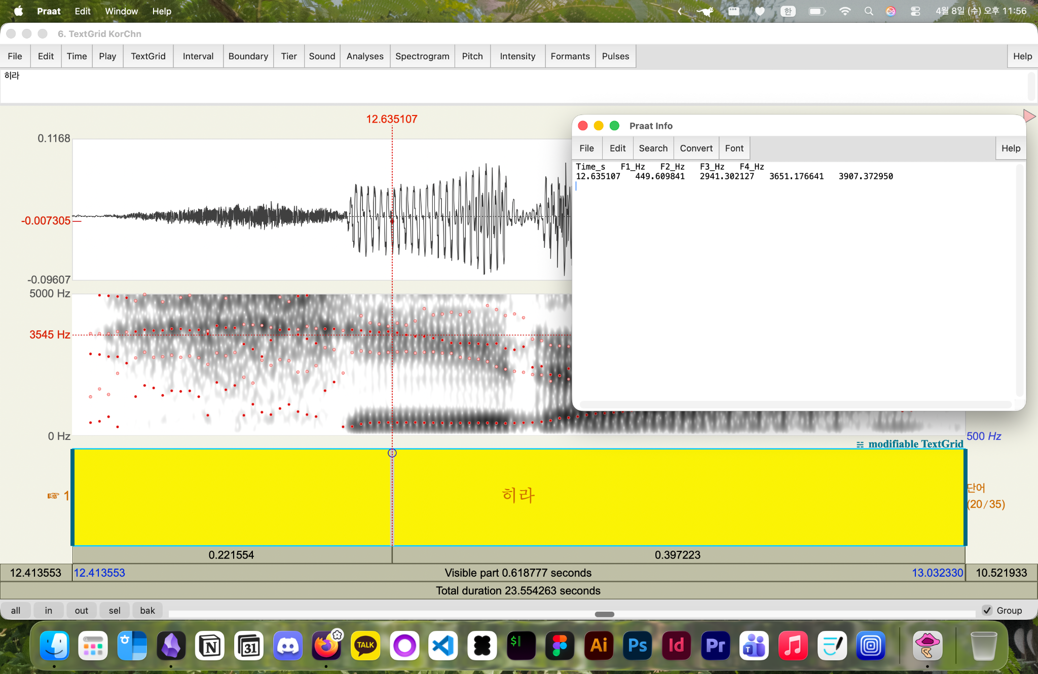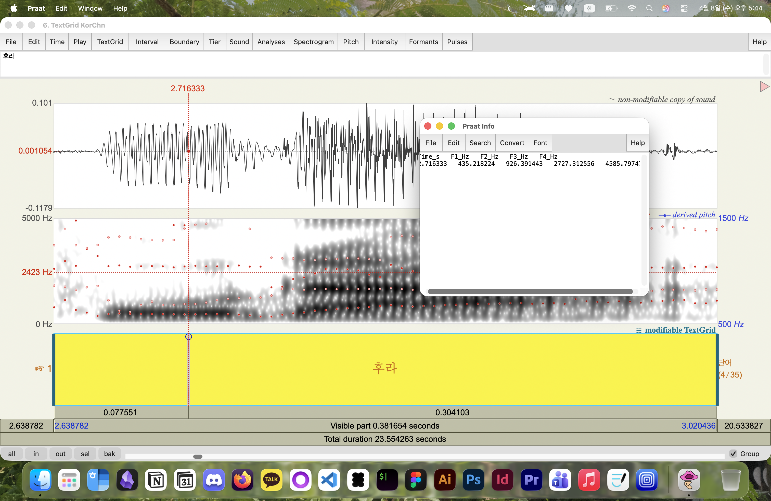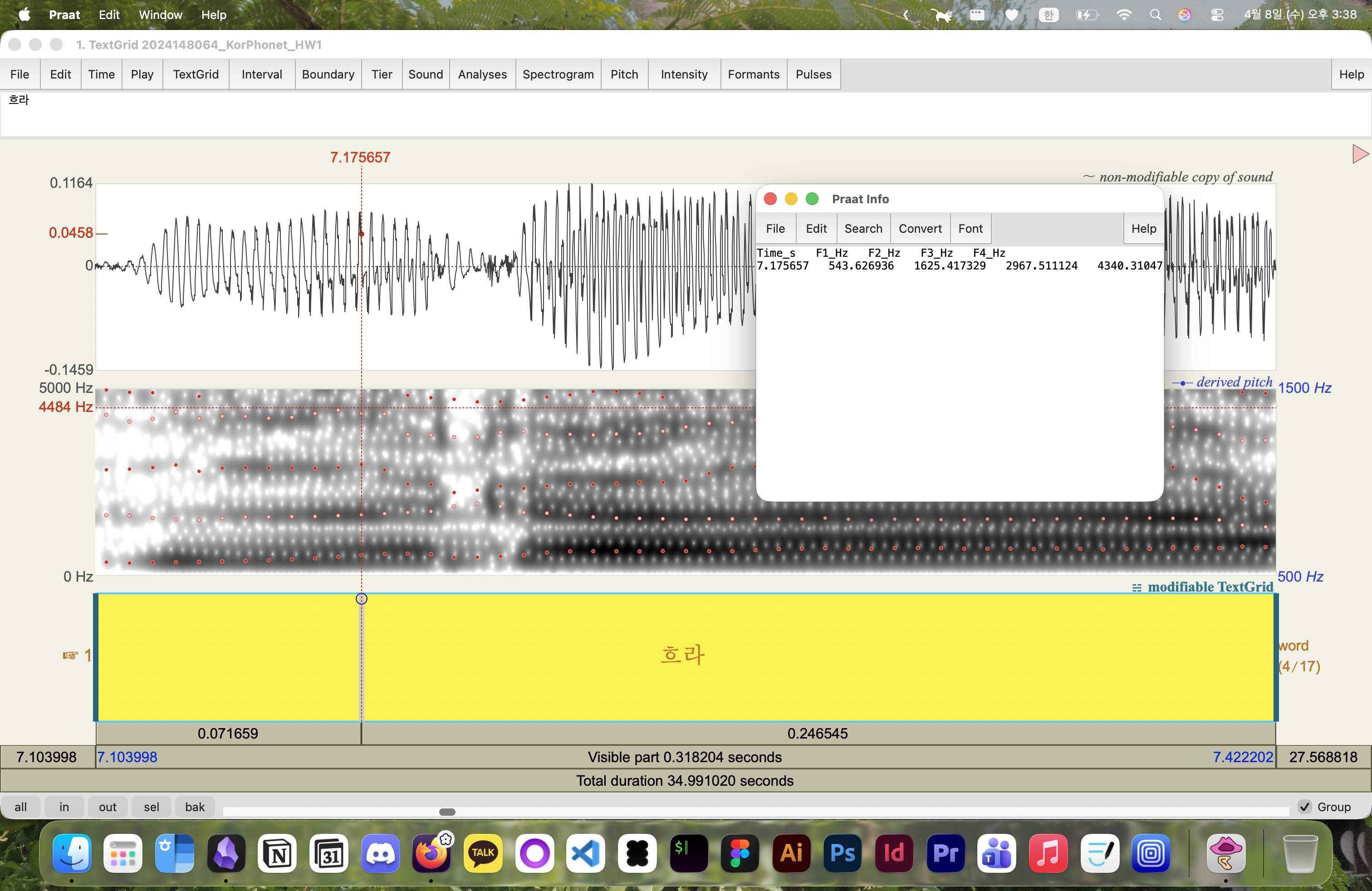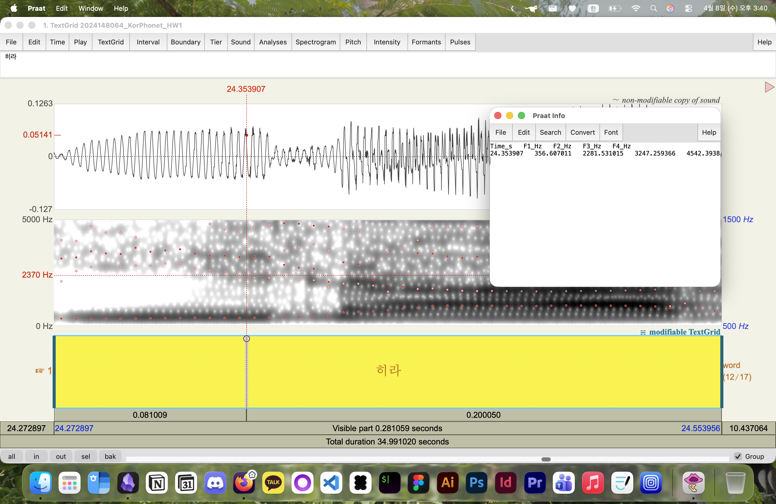 - Homework에서 사용한 음성 파일을 textgrid로 분절하고, F1과 F2를 기록하였다. 이때 praat의 자체 formant listing 기능을 사용하고, 값에 이상이 있는 경우 추가적으로 후보정하는 방식을 사용하여 소주 셋째자리까지 값을 표기하였다.