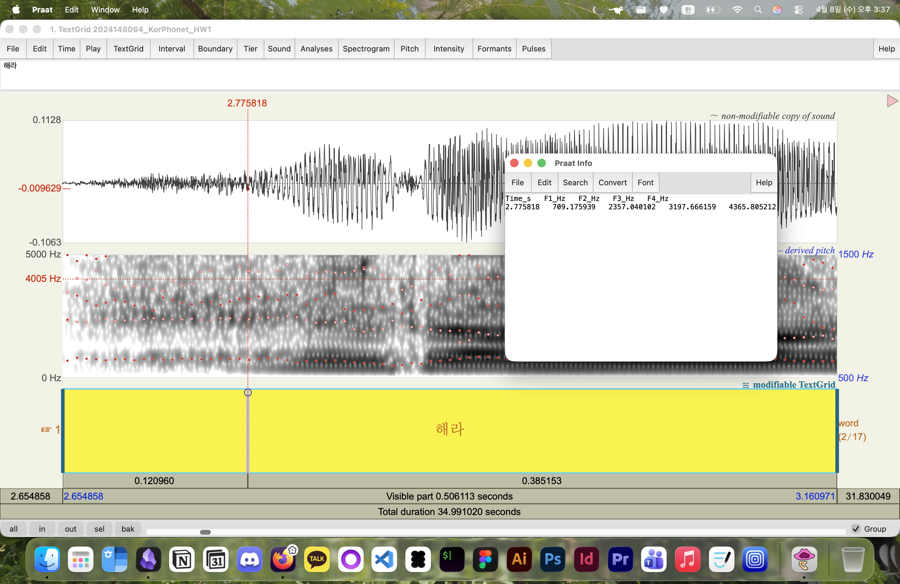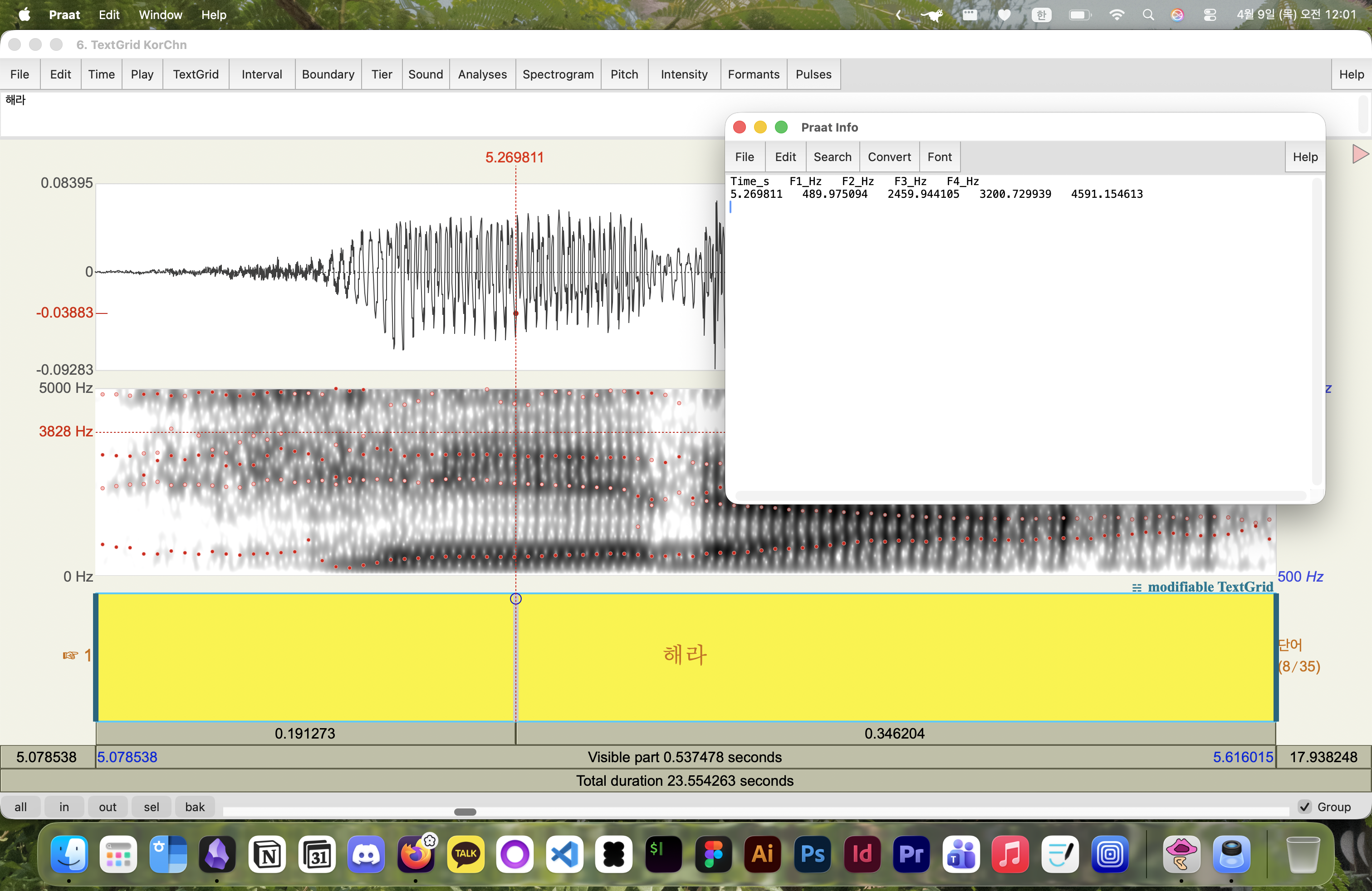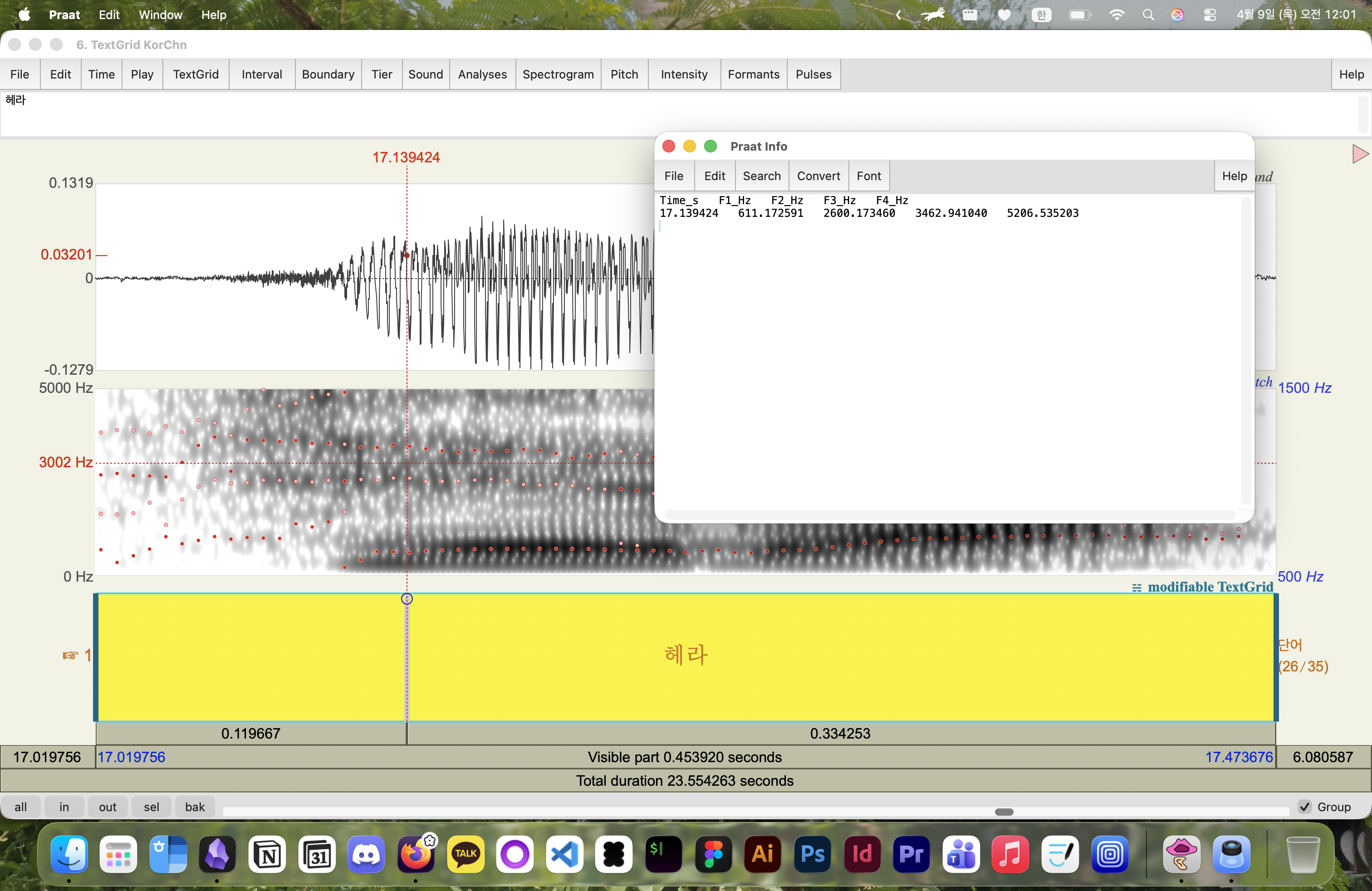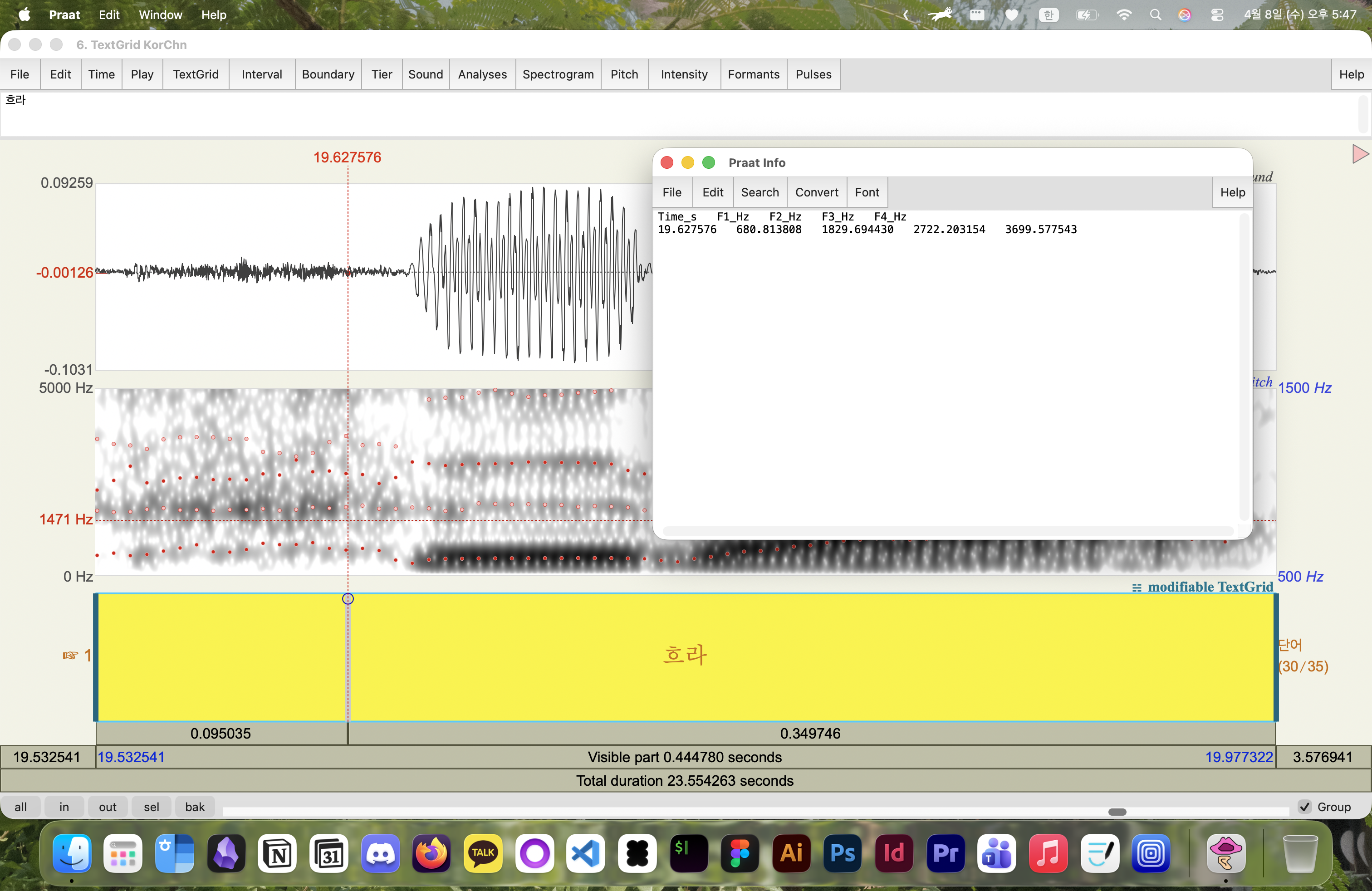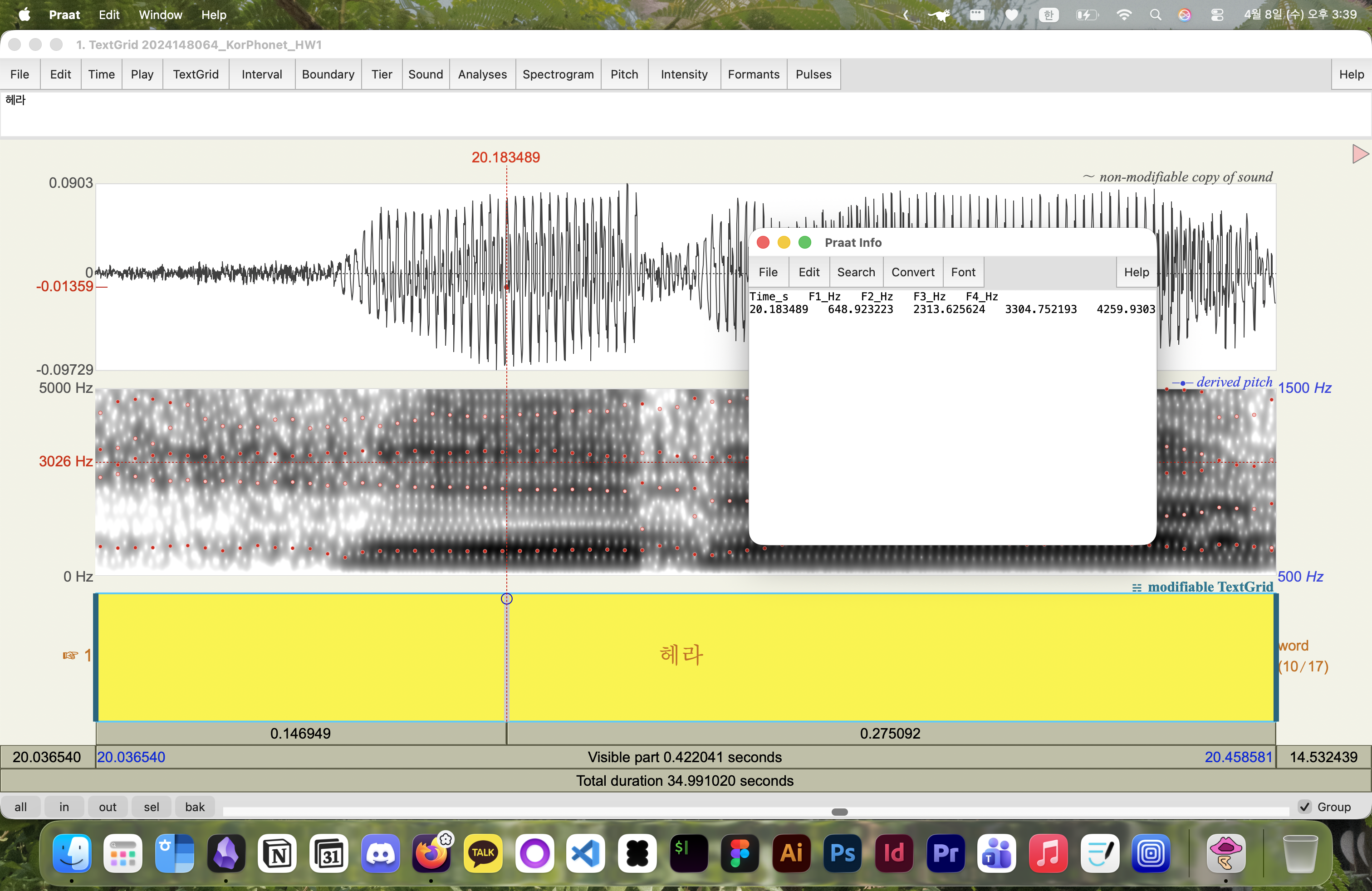 - Homework에서 사용한 음성 파일을 textgrid로 분절하고, F1과 F2를 기록하였다. 이때 praat의 자체 formant listing 기능을 사용하고, 값에 이상이 있는 경우 추가적으로 후보정하는 방식을 사용하여 소주 셋째자리까지 값을 표기하였다.
