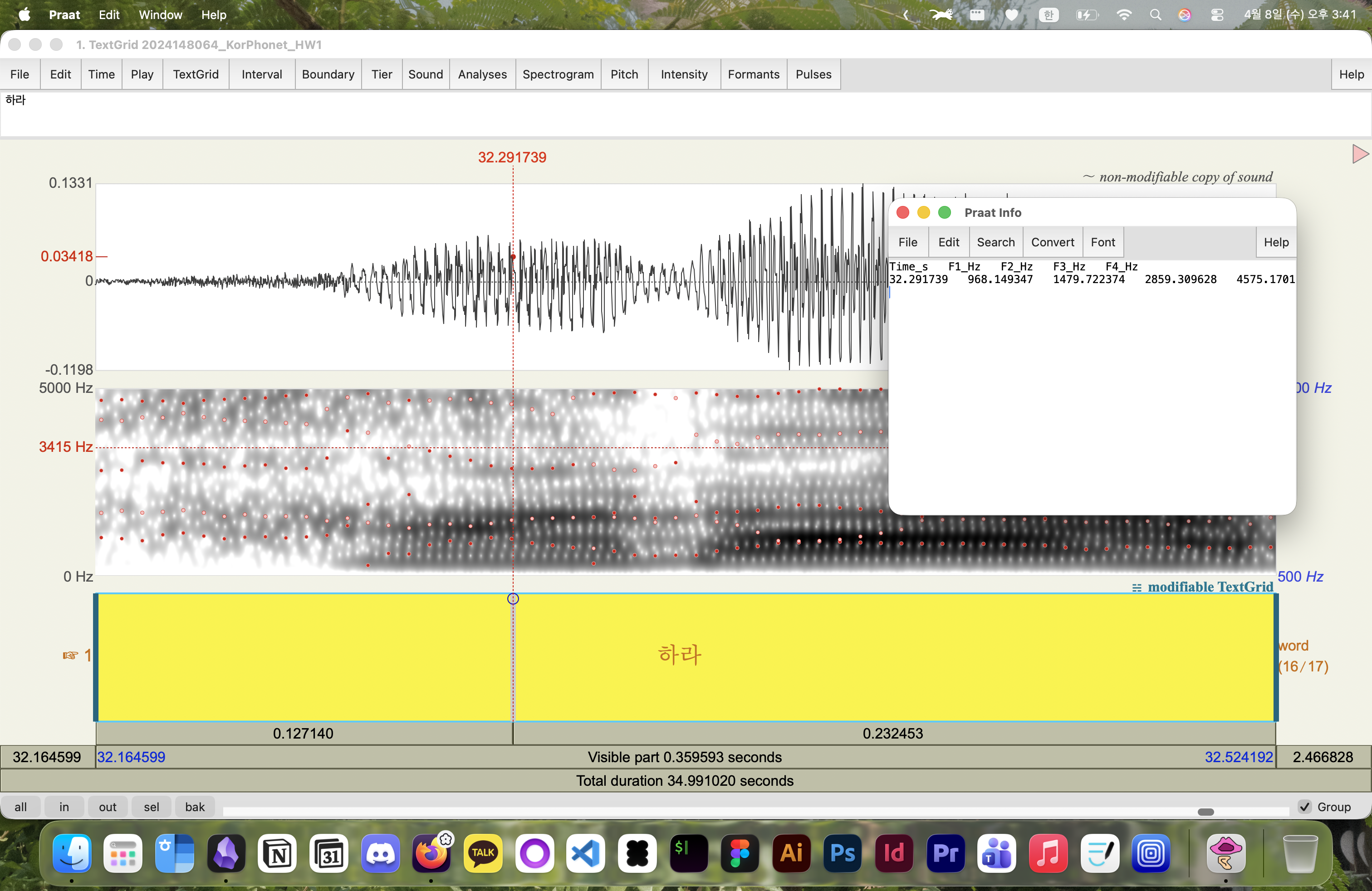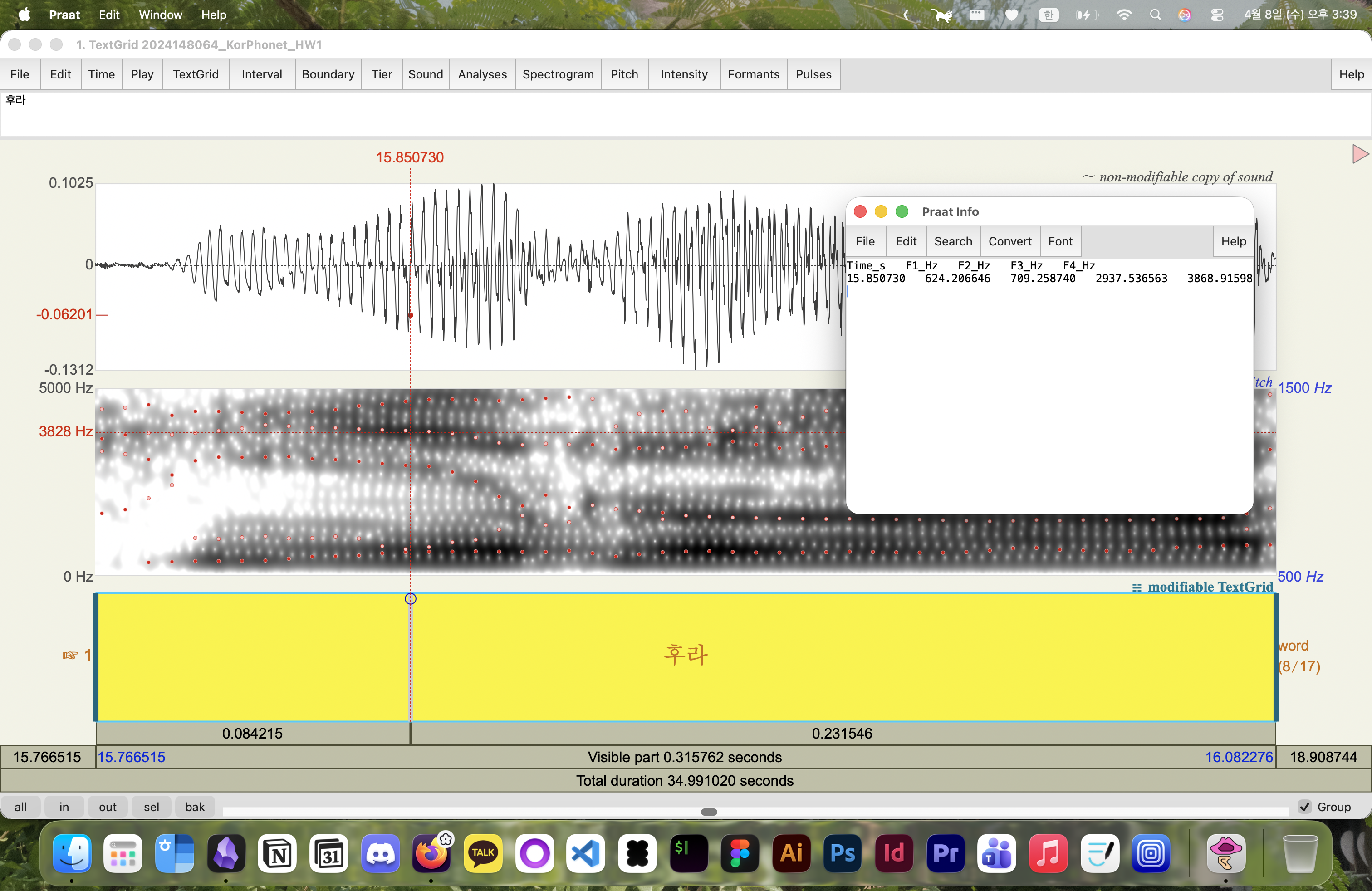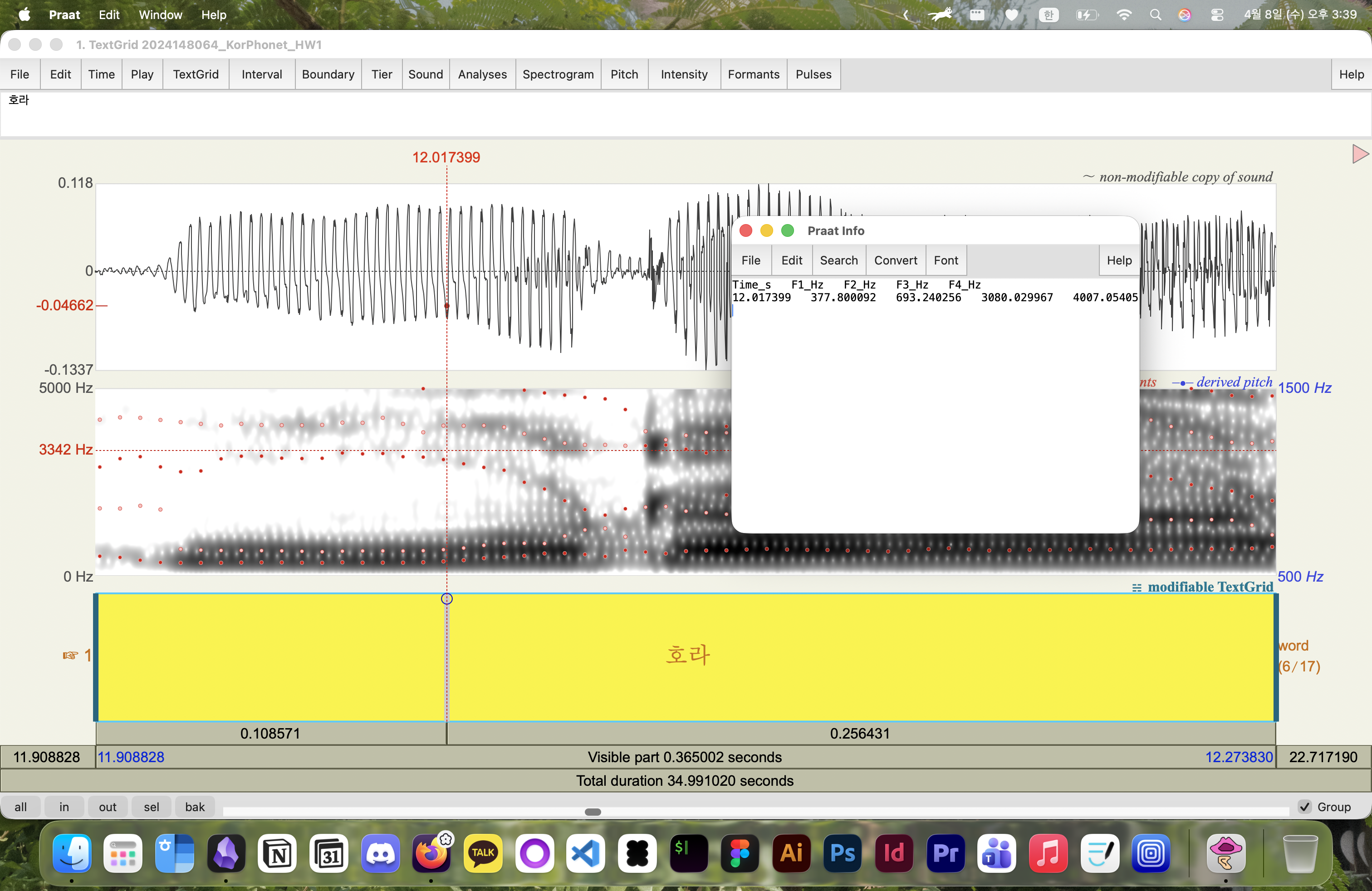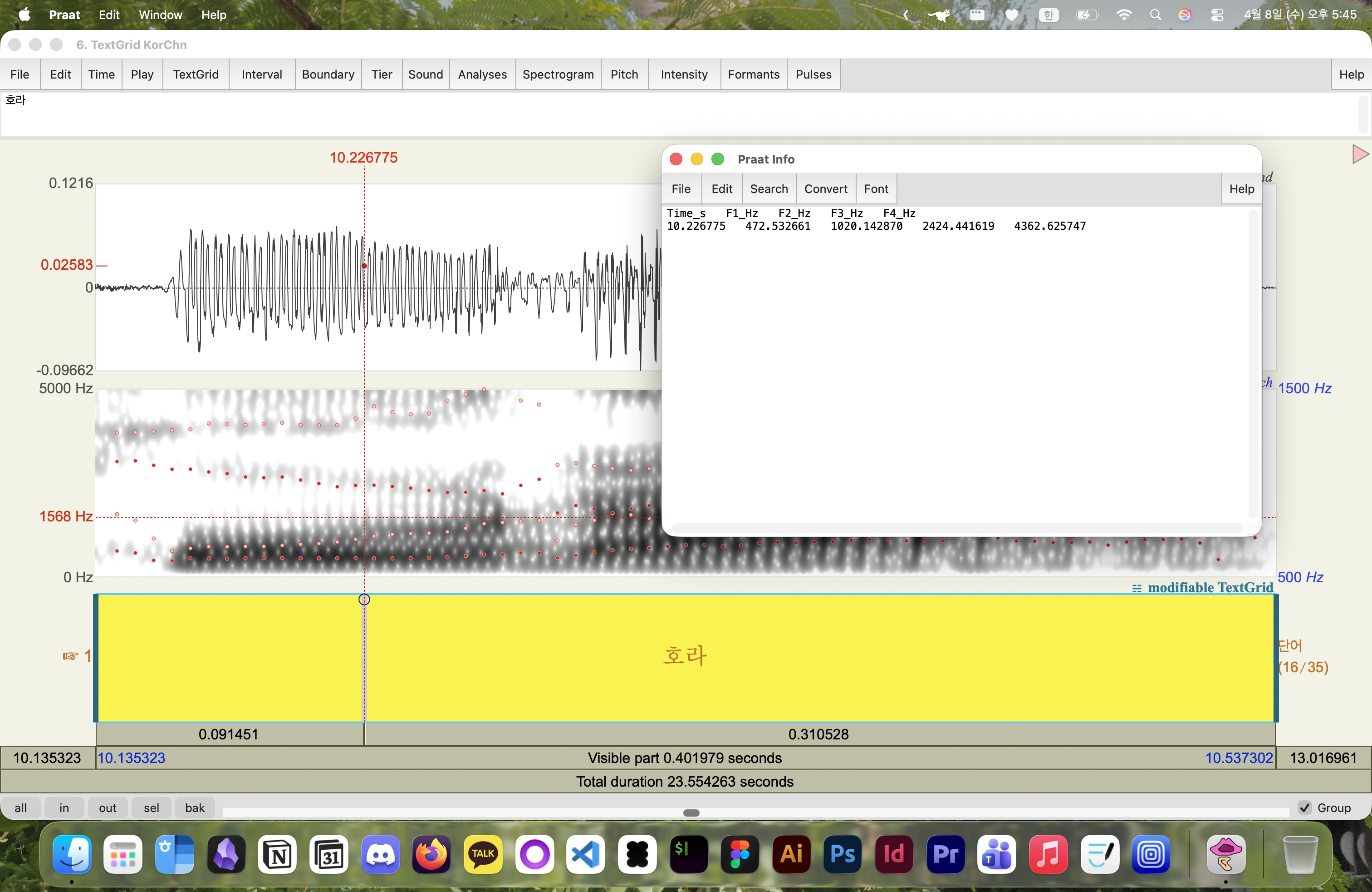 - Homework에서 사용한 음성 파일을 textgrid로 분절하고, F1과 F2를 기록하였다. 이때 praat의 자체 formant listing 기능을 사용하고, 값에 이상이 있는 경우 추가적으로 후보정하는 방식을 사용하여 소주 셋째자리까지 값을 표기하였다.