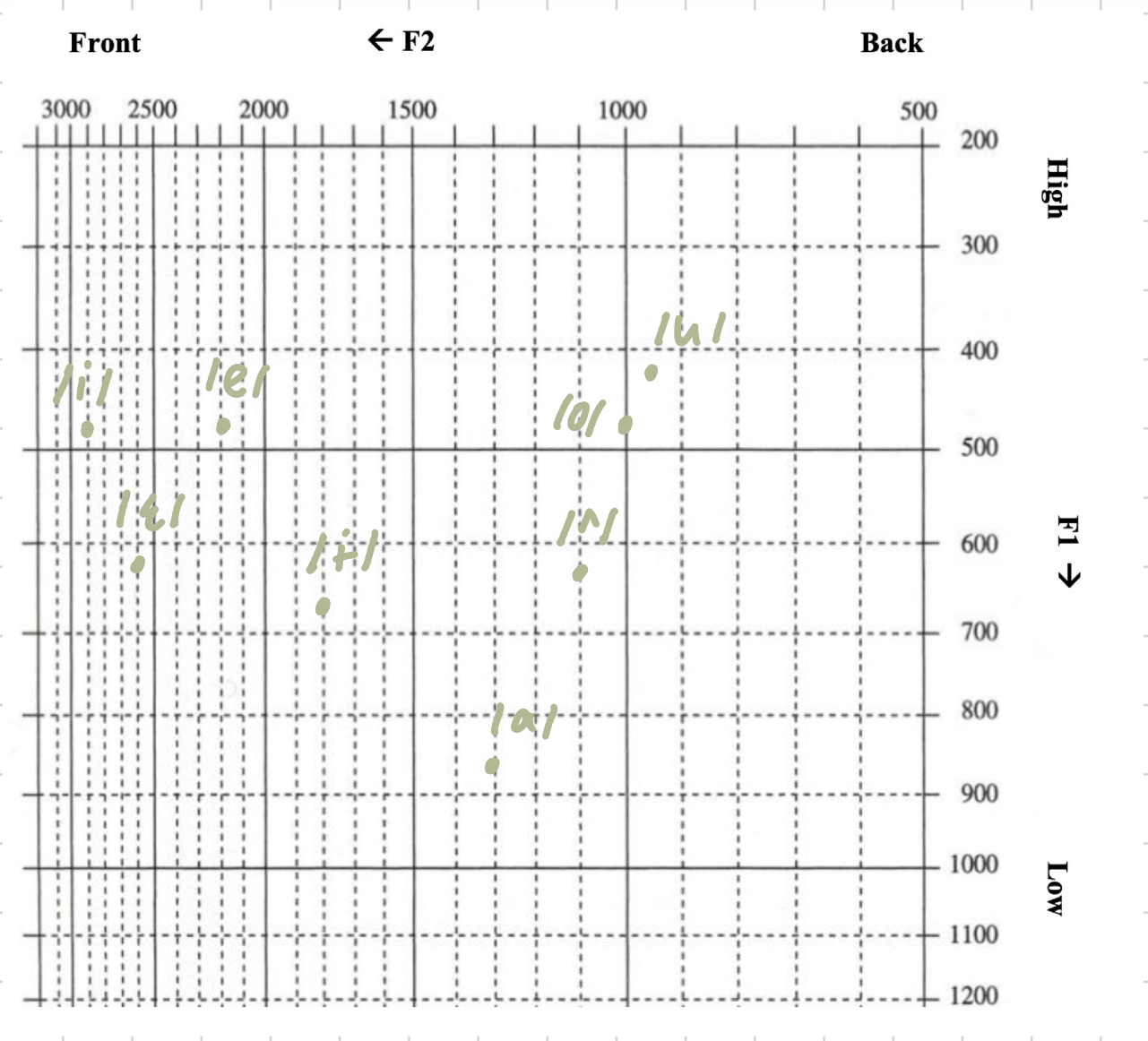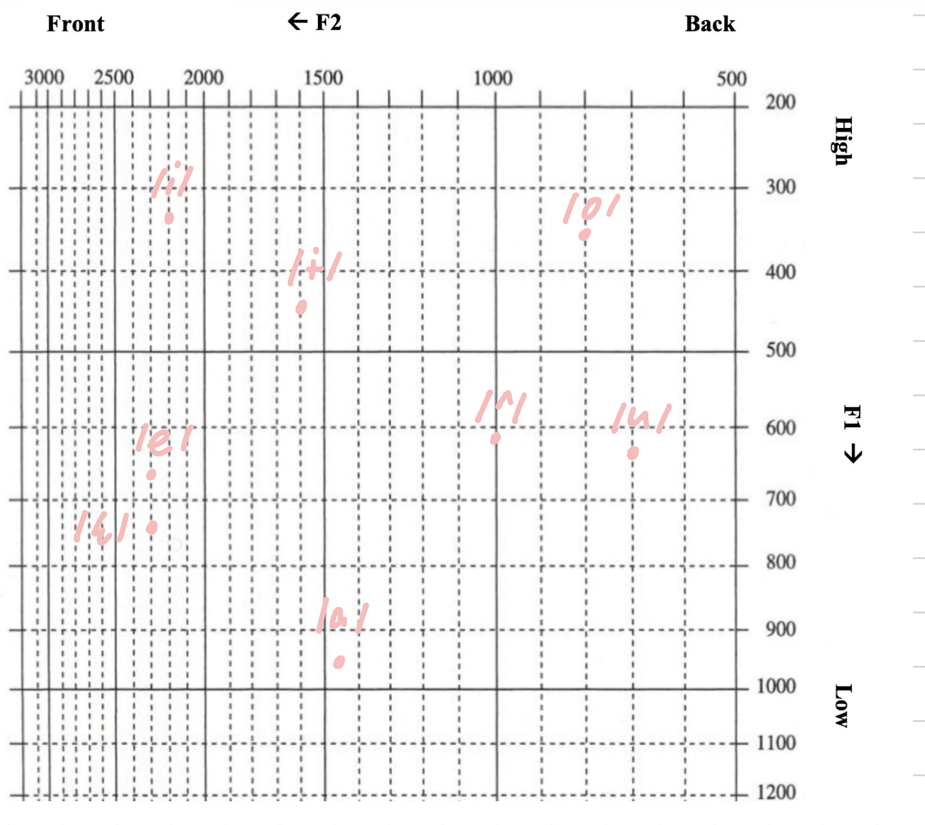 - 측정된 F1과 F2를 바탕으로 표에 각 모음의 위치를 표기하였다. 전반적으로 대체로 예상되는 위치에 놓였다고 볼 수 있었다. 먼저 /i/는 F1이 356.607Hz로 매우 낮고 F2가 2281.531Hz로 높게 나타나, 높은 전설모음의 특성을 비교적 잘 보여 주었다. /o/ 역시 F1이 377.800Hz로 낮고 F2가 693.240Hz로 낮게 측정되어, 높은 후설모음으로 해석할 수 있다.