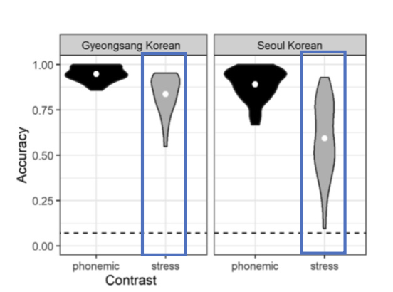 - L1 prosodic transfer(운율 전이) in stress perception(강세지각)