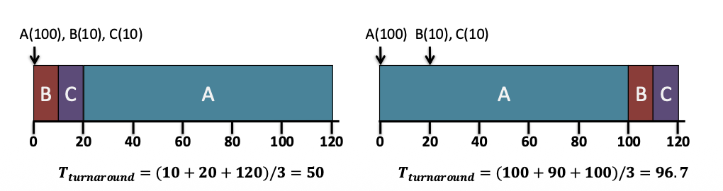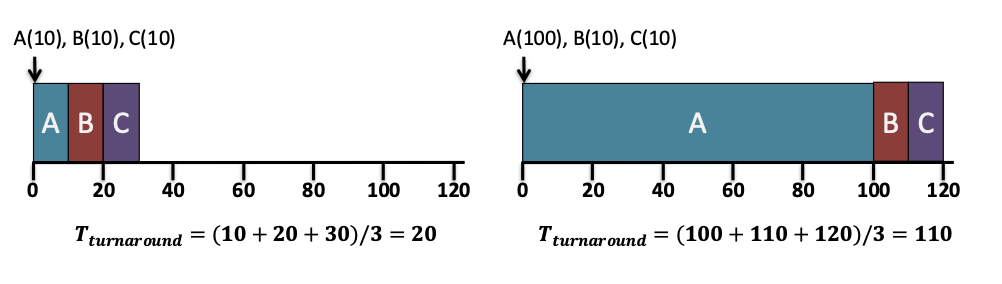 평균 turnaround time: \frac{10 + 20 + 120}{3} = 50